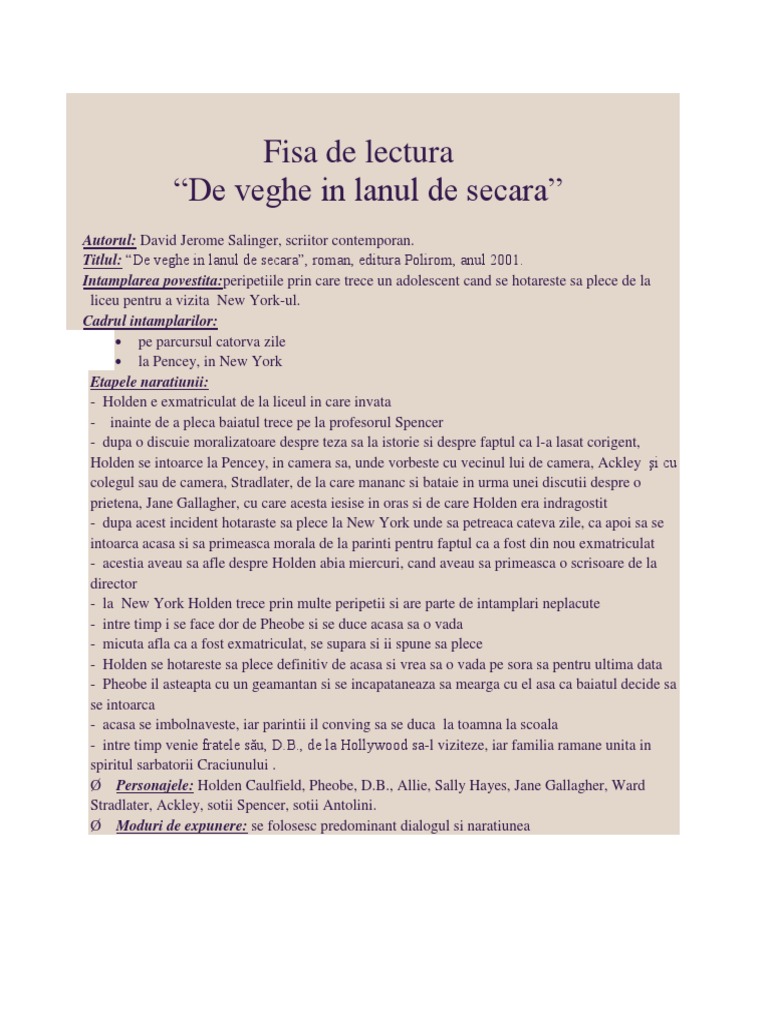 De Veghe In Lanul De Secara Comentariu