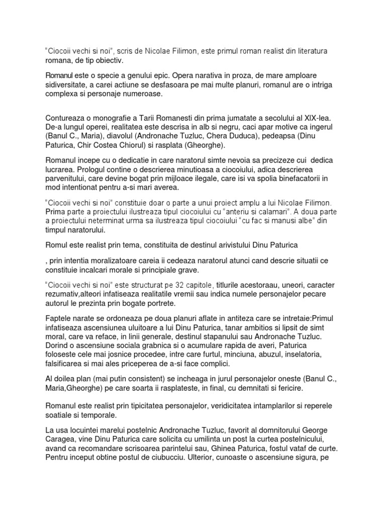 Romanul Ciocoii Vechi Si Noi Comentariul