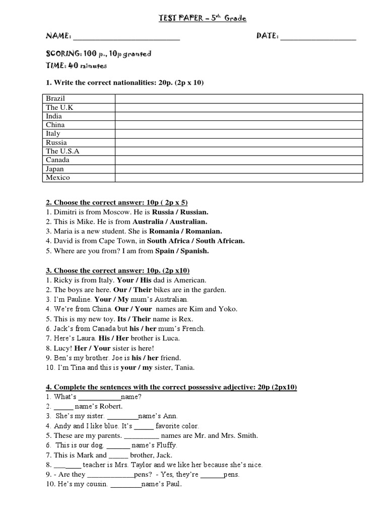 1 Write The Correct Nationalities 20p 2p X 10